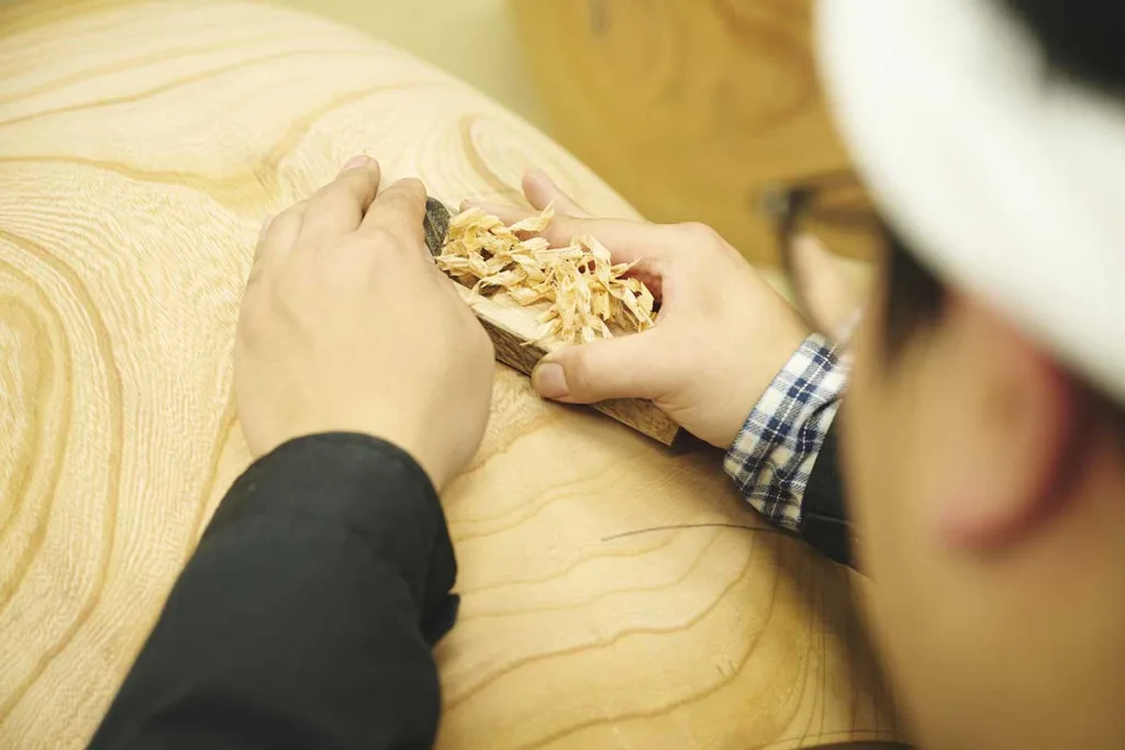 For example, surfaces are finished by hand using kanna (Japanese hand planes). The results differ entirely from machine cutting: planing by hand allows the wood to be shaped evenly and finished with greater precision and clarity.