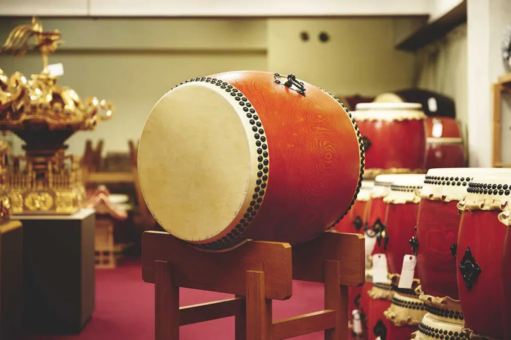 Both wadaiko and omikoshi (portable shrines) are produced from the ground up. Beyond omikoshi, we also work with festival implements used in local rites. Beyond wadaiko, we also work with narimono—traditional Japanese sound-making instruments such as tsuzumi hand drums and other percussion used in Japanese music. Ritual items such as Buddhist altars and Shinto household shrines are also handled as part of this work.